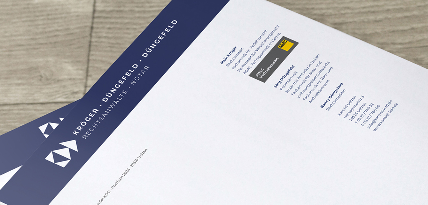 Im Auftrag der Anwaltskanzlei KDD haben wir Briefpapier und Visitenkarten mit dem Logo des Notariats erstellt, sowie ein passendes Firmenschild bedruckt, welches die Mandanten in Empfang nimmt. Auch die Website der Kanzlei haben wir im gleichen Farb- und Designkonzept wie das Logo, individuell entworfen und fertiggestellt. Zudem werden die Social Media Accounts der Kanzlei von uns durch regelmäßige Posts und Interaktionen mit anderen Unternehmen, stark in ihrer Popularität und Internetpräsenz gefördert.